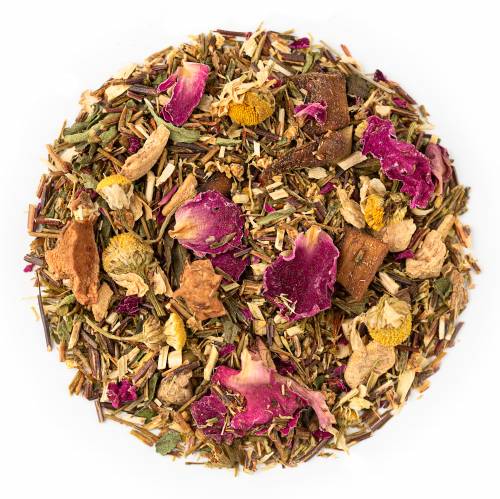 Green rooibos*, mango pieces*, chamomile*, ginger root*, apple pieces*, elder flowers*, stevia*, rose petals*, natural essences (*organic)